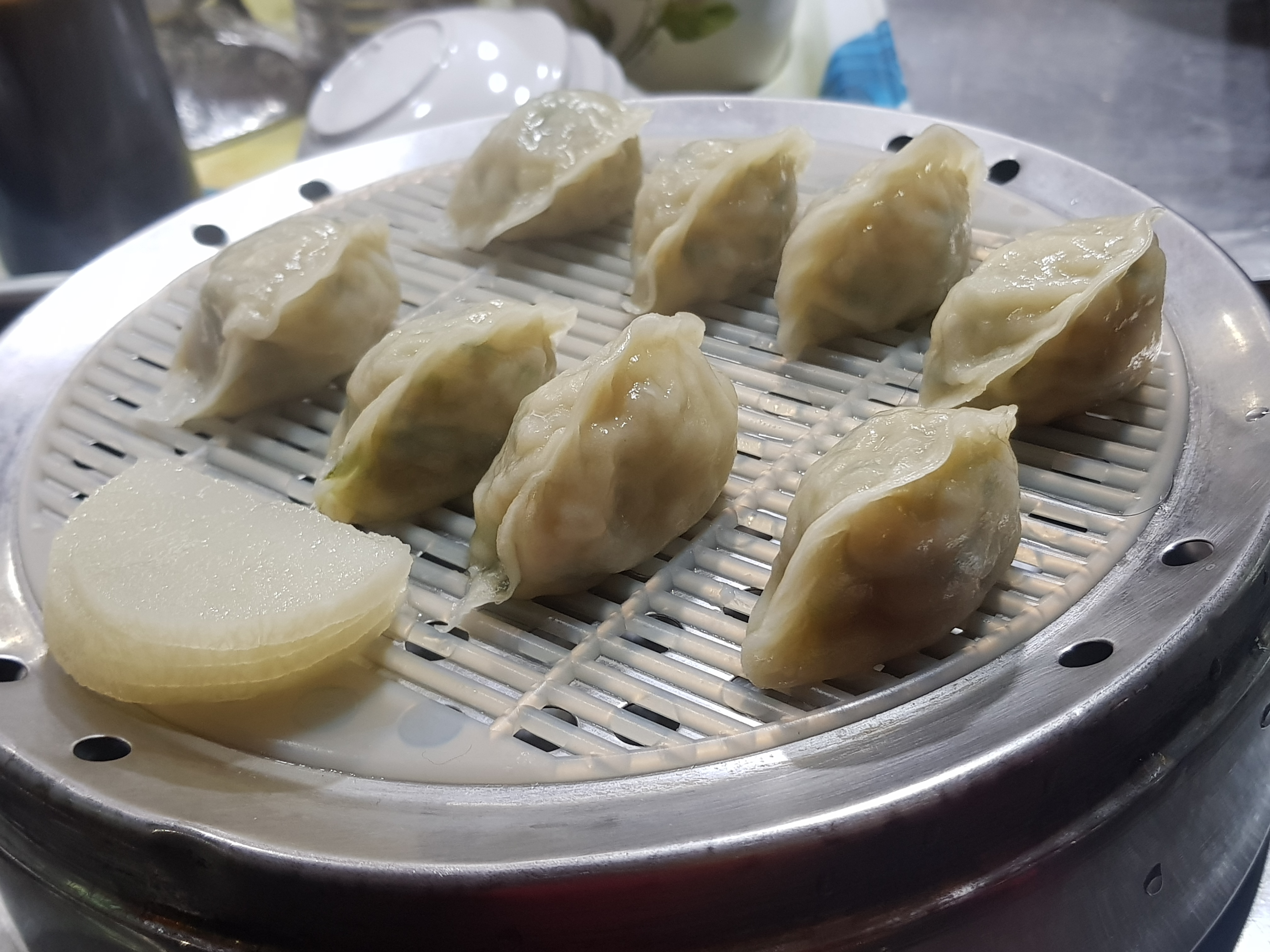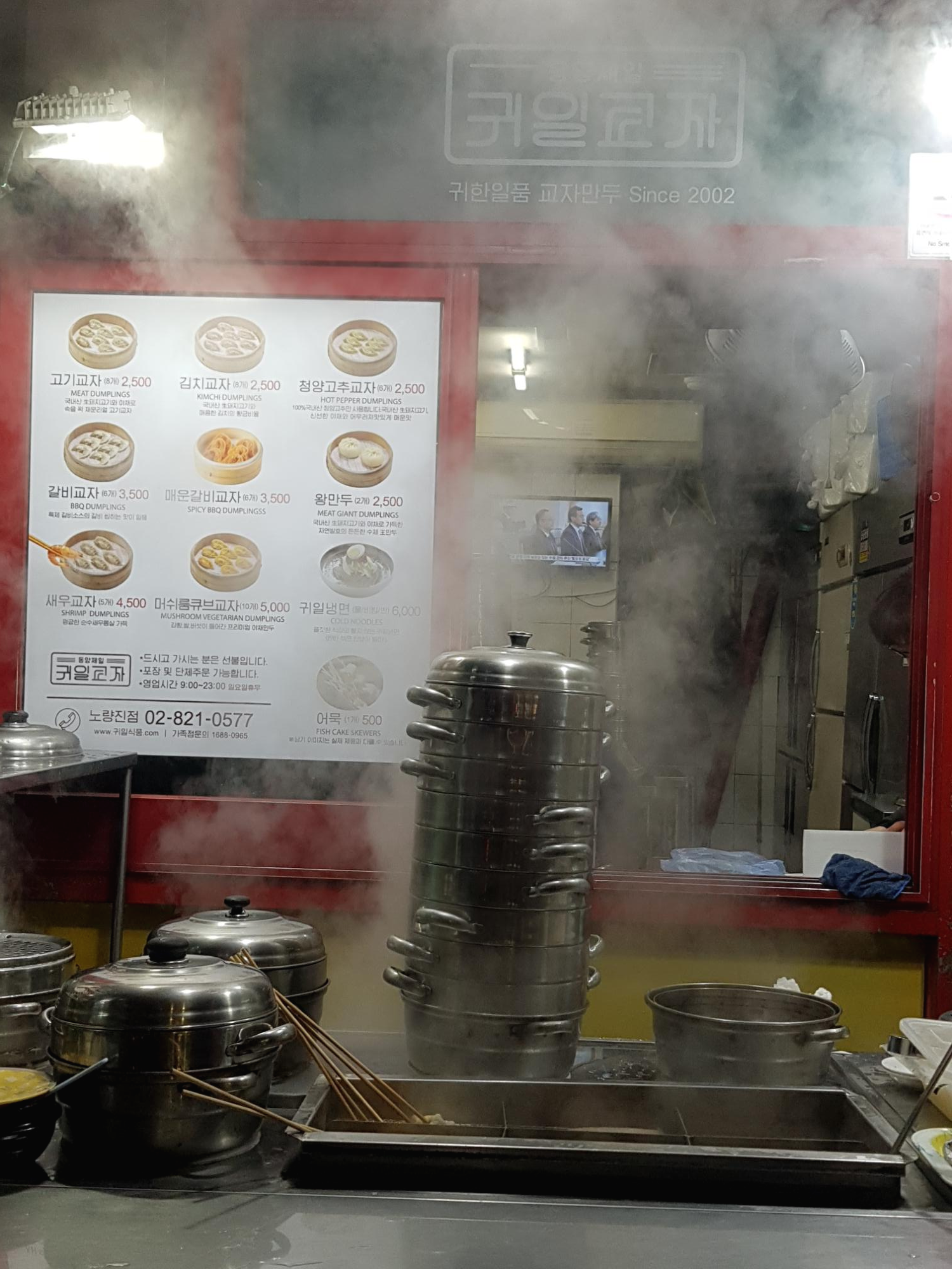 만두찌는 연기가 자욱해서 메뉴판을 찍을 수가 없네요 ㅋㅋㅋㅋ가게 내부에는 만두 찜기가 줄줄이 쌓여 있네요. 만두를 기다리면서 어묵과 어묵국물을 호로록 먹어치우고요.