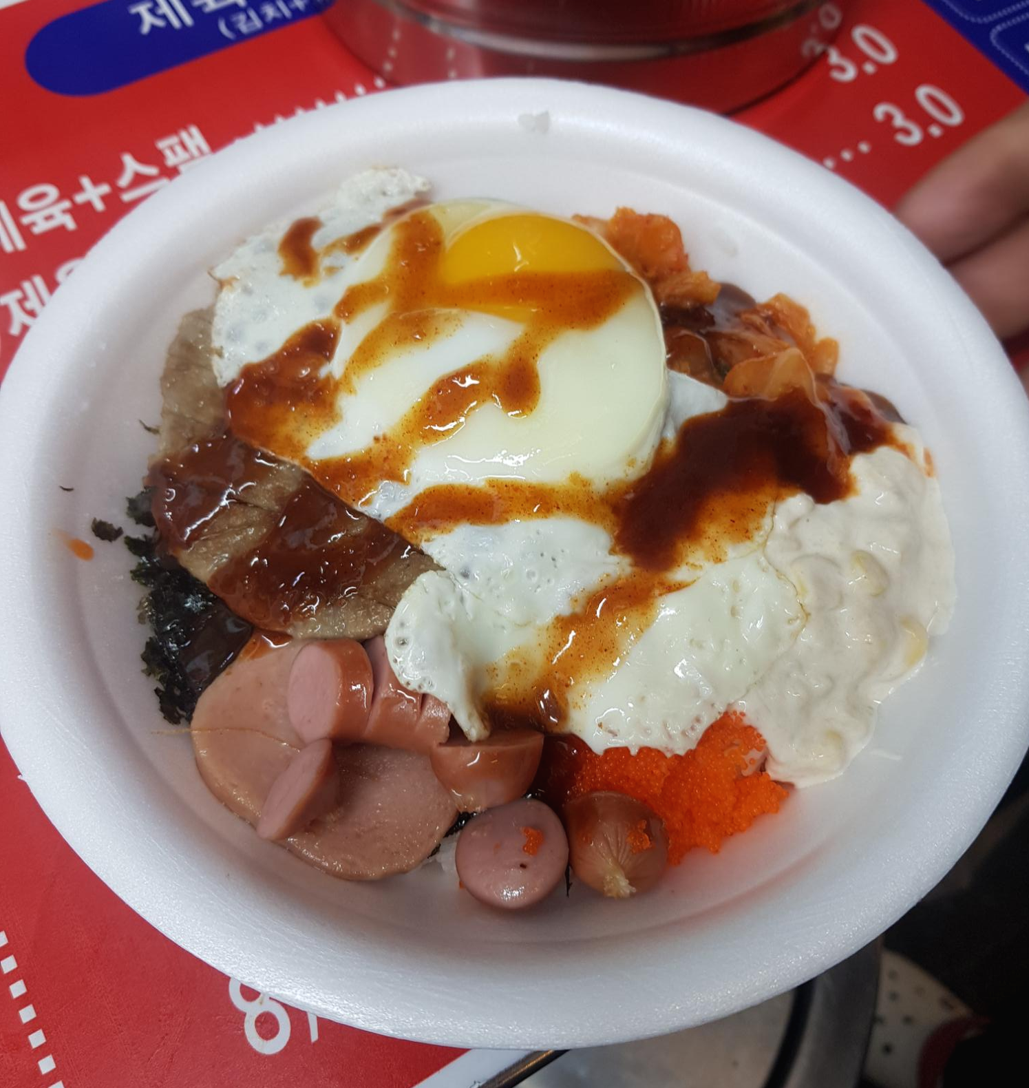 모금스페셜 1번으로 스팸이랑 떡갈비랑 날치알 등등이 들어간 컵밥으로 선택했습니다. 이 한끼가 식사였다면 제육이나 삼격살이 있는 것을 선택했을텐데 다른 먹을 것들을 생각하며 좀 간소한 것으로 선택했죠. 메뉴가 워낙 많아서 눈이 돌아갑니다.