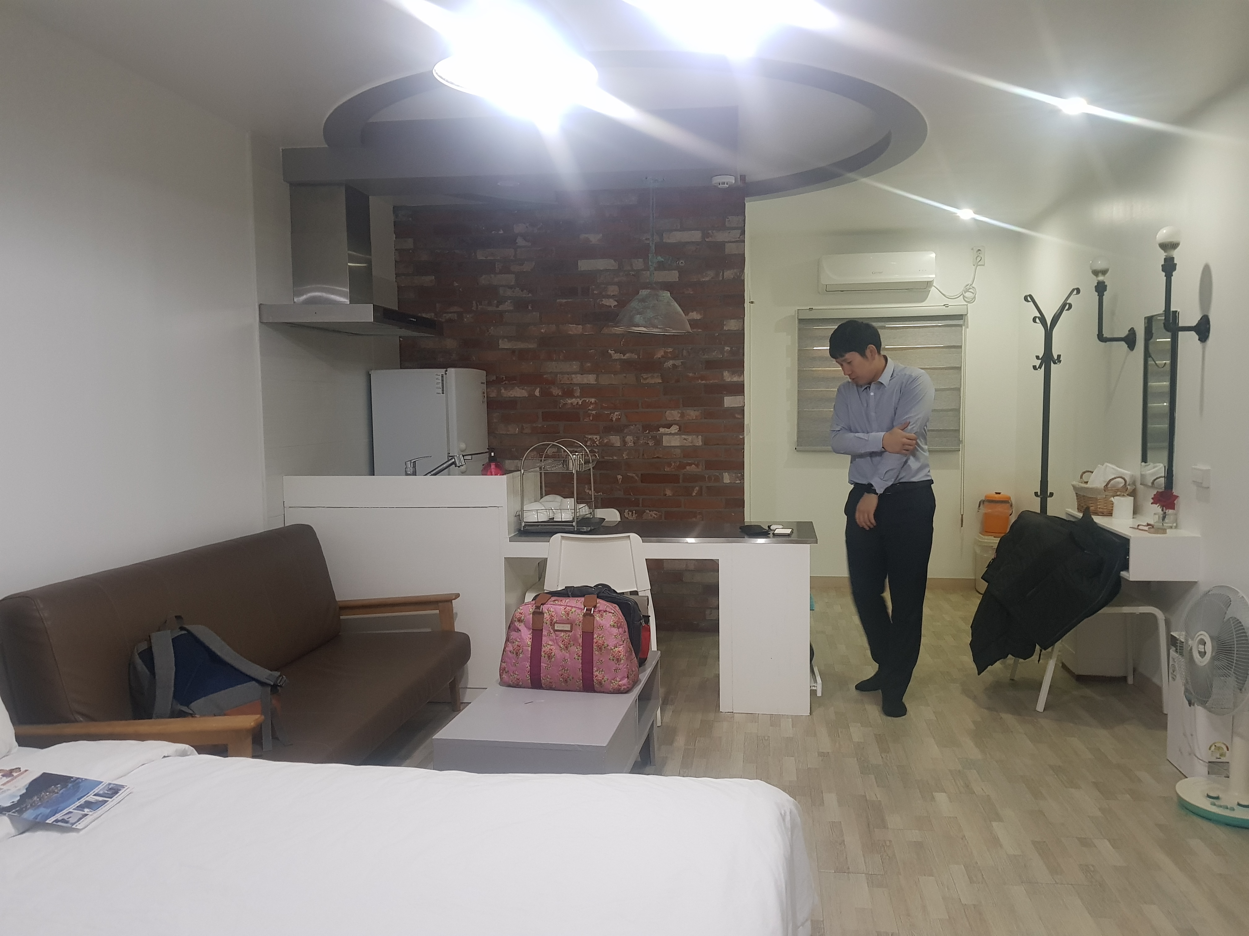 저희가 묵었던 방인데 깔끔했어요. 색깔진한 이불 넘 싫어하는데 하얀 호텔식 침구를 매일 교체한다니 맘에 들었습니다. 기본적인 물품이 거의 다 구비 되어 있구요, 방도 따뜻했습니다. 사진을 못찍었는데 스파는 이 사진을 찍은 저의 뒷편에 있어요. 입구 들어와서 바로 스파+실내바비큐실이 있고 거길 지나야 방입니다. 스파사진은 홈페이지에서 확인이 가능하겠죠. 스파 욕조가 물때 없이 깨끗한 건 좋았는데요, 물을 받고 스파를 켜니까 이물질이 조금 나오더라구요. 한번 확인하시는게 좋을 것 같긴해요.