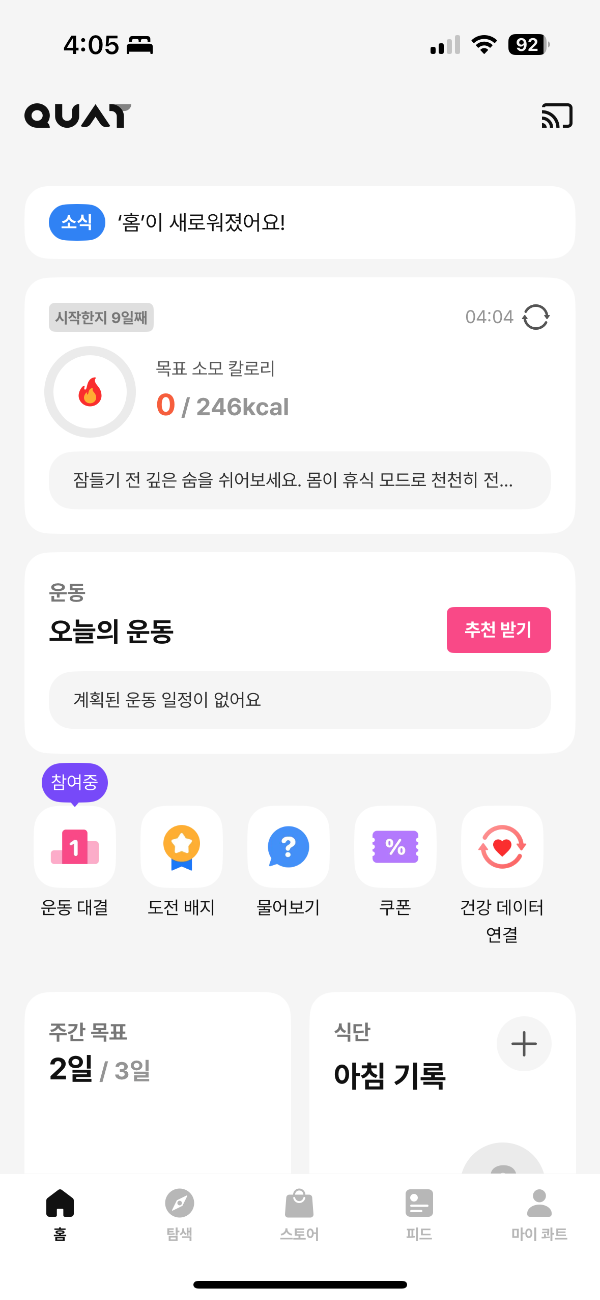 아무튼 25주 챌린지를 성공한 저는 여기서 끝나지 않을 것입니다. 최근 콰트 어플이 홈화면 개선을 하면서 더 구경할 거리들이 생겼는데요,