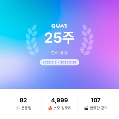 콰트 어플을 이용해 운동을 한 지 드디어 25주가 되었네요.